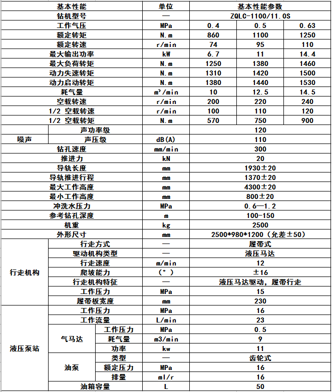 ZQLC-1100/11.0S氣動履帶式鉆機是我公司生產的新一代履帶行走式鉆機。是一種以壓縮空氣為動力,履帶行走式輕型深孔鉆機。適用于煤礦井下采用高效螺旋鉆桿和硬質合金鉆頭在煤層中的探水、探瓦斯及瓦斯抽放孔的施工。該設備具有結構緊湊、操作靈活、機動性能強、安全性能好。整機采用獨立模塊化設計,方便故障部位維修更換,較大程度上縮短了維修保養的時間。
